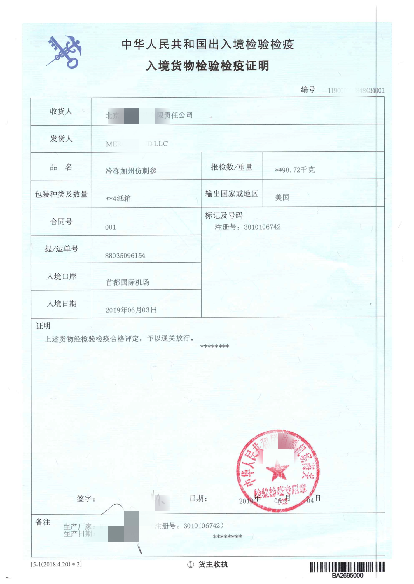 Then enter the http://online.customs.gov.cn/ Internet + customs platform, in the "import and export food" module, do "import aquatic product storage cold record" and then do "import animal and product quarantine approval", get the following quarantine certificate.